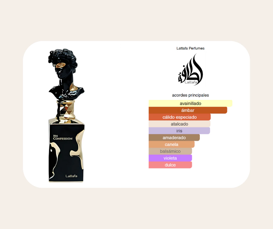 His Confession de Lattafa es una fragancia elegante y seductora que combina sofisticación con un toque de misterio. Desde el inicio, destaca con notas frescas y especiadas de bergamota, pimienta negra y canela, que aportan energía y carácter. En su corazón, un acorde refinado de lavanda, cuero y hojas de violeta revela una masculinidad moderna y segura. Finalmente, su fondo de ámbar, vainilla y maderas ahumadas envuelve la piel con una calidez irresistible y duradera.